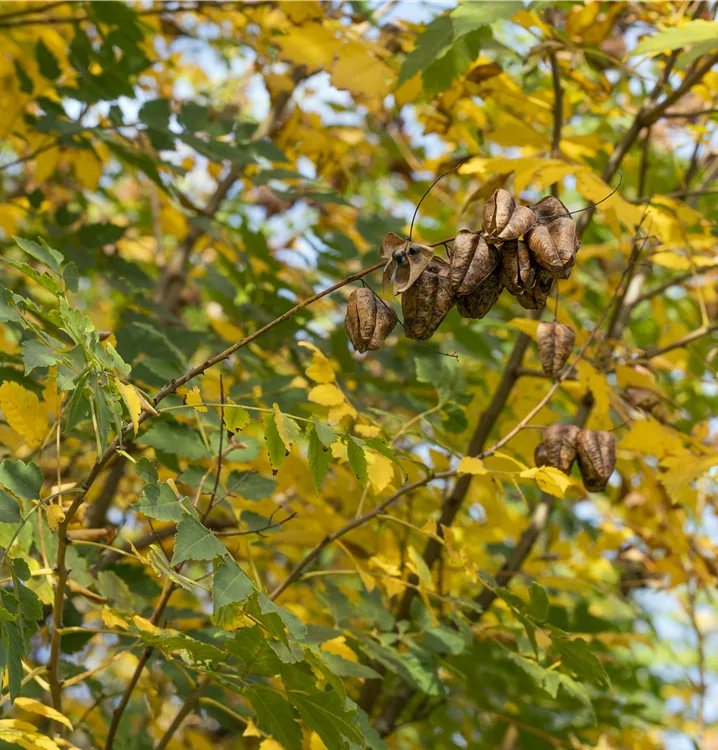 Besonders dekorativ sind die rot-braunen Früchte von Koelreuteria paniculata 'Coral Sun'. Haften sehr lange.