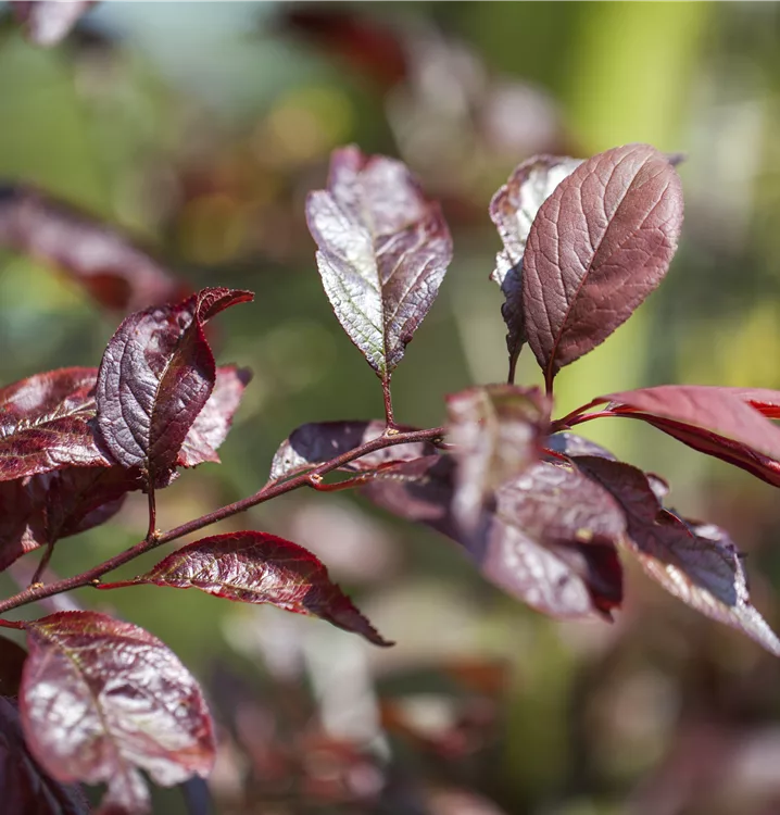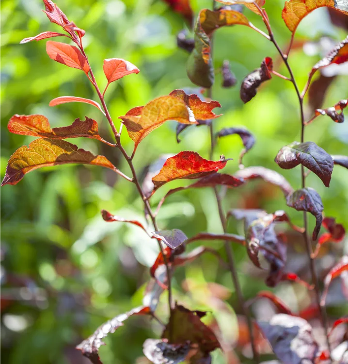 Die sommergrünen Blätter der Zierpflaume 'Trailblazer' sind grün-rot, eiförmig, wechselständig. Diese sind etwa 5 - 7 cm gross. Bronzefarbener Austrieb. Zierpflaume 'Trailblazer' zeigt sich leuchtend dunkelrot im Herbst.