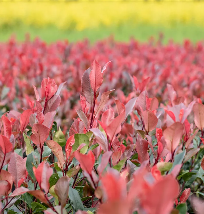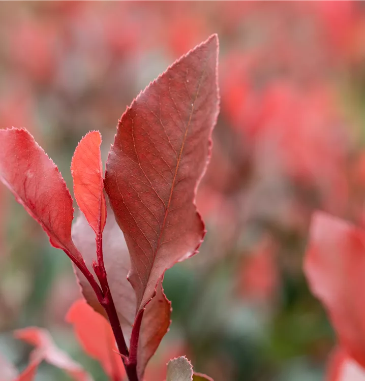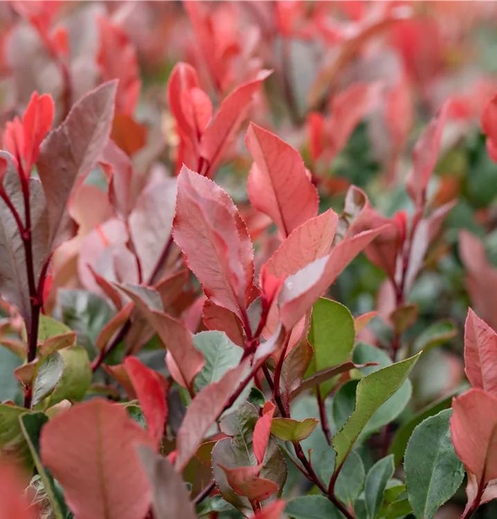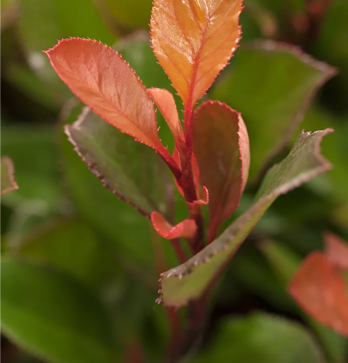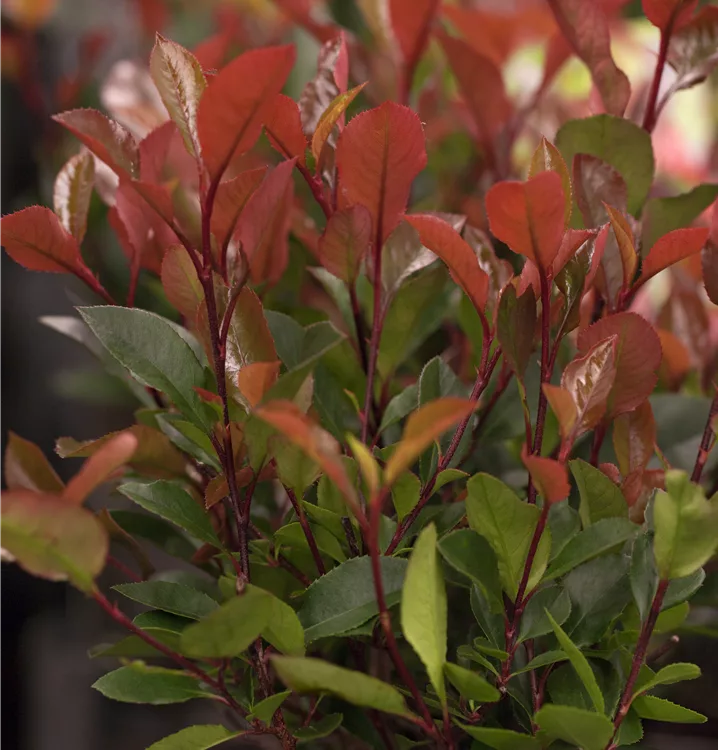 Die immergrünen Blätter der Glanzmispel 'Little Red Robin' sind dunkelgrün, lanzettlich, glänzend. Roter Austrieb.