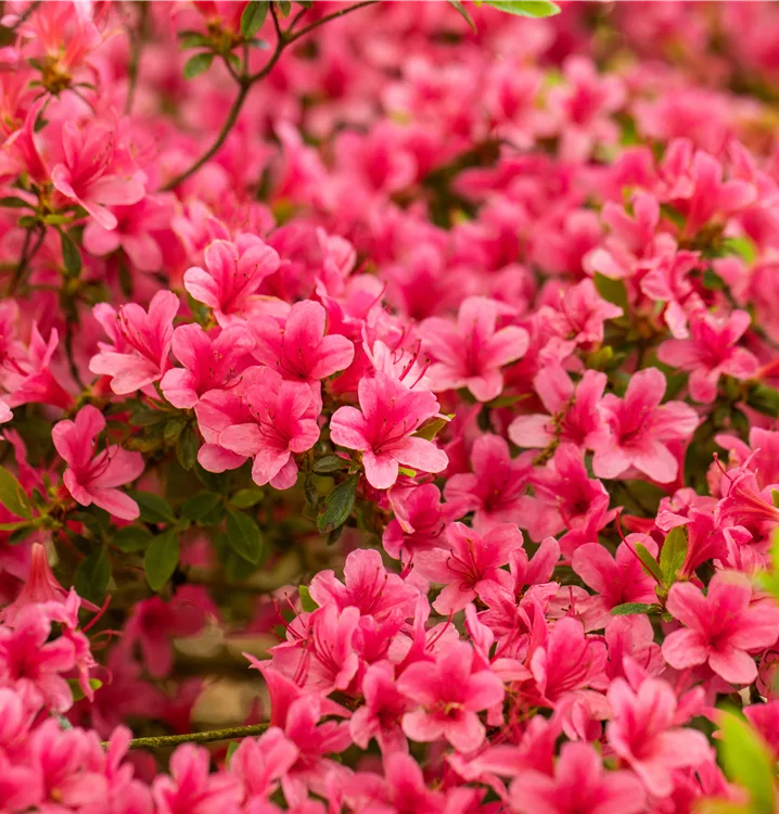 Die Japanische Azalee 'Arabesk' (Rhododendron obtusum) bringt im Mai ein wahres Meer aus karminroten Blüten hervor. Ihr wintergrünes Laub ist dunkelgrün. Dieses aufrecht, gedrungen wachsende Gehölz erreicht gewöhnlich eine Höhe von 1 m und eine Breite von 1 m. Ein halbschattiger (bis schattiger) Standort und ein durchlässiger, nährstoffreicher, saurer Boden schaffen optimale Bedingungen für ein gesundes Wachstum. Die Japanische Azalee 'Arabesk' ist gut frostverträglich.