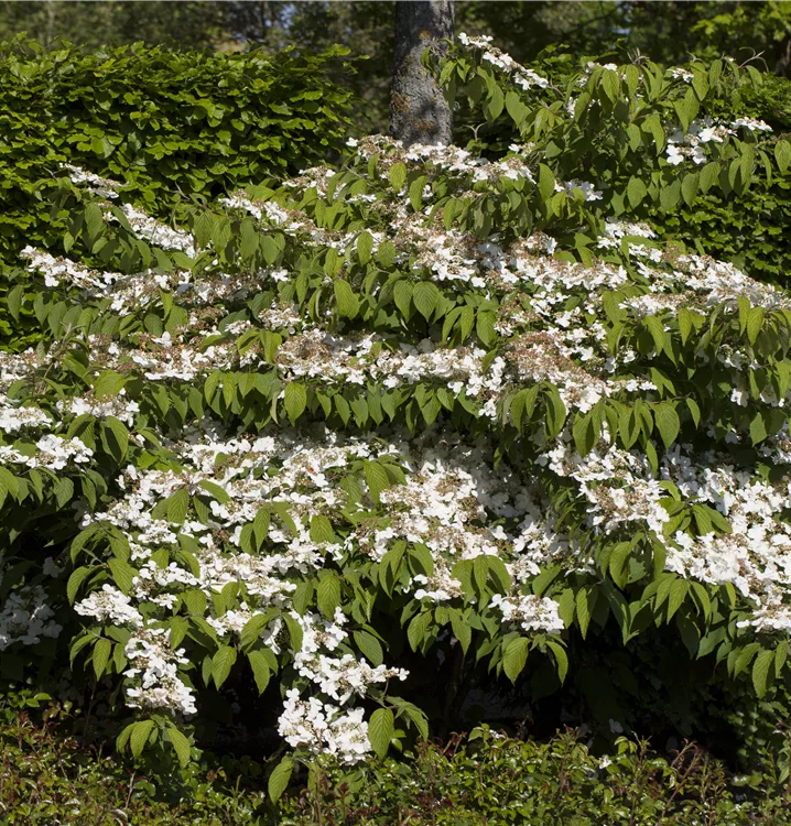 Der Japanische Schneeball (Viburnum plicatum) ist ein breiter, rundlicher Strauch, der weisse, später rosafarbene, in Trugdolden angeordnete Blüten mit einem starken Duft hervorbringt. Sie erscheinen von Mai bis Juni. Aus diesen gehen schwarz-rote Früchte hervor. Sie verströmen einen starken Duft. Zudem trägt der Japanische Schneeball, eiförmige, mittelgrüne Blätter. An einem sonnigen bis halbschattigen Standort mit humosem, nährstoffreichem Boden erreicht er gewöhnlich eine Höhe von ca. 3 m und wird ca. 3 m breit.