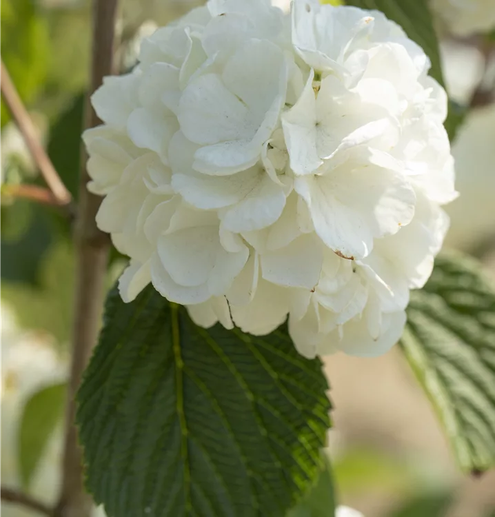 Die weissen, später rosafarbenen, gefüllten Blüten des Japanischen Schneeball erscheinen in Trugdolden von Mai bis Juni. Diese sind stark duftend.