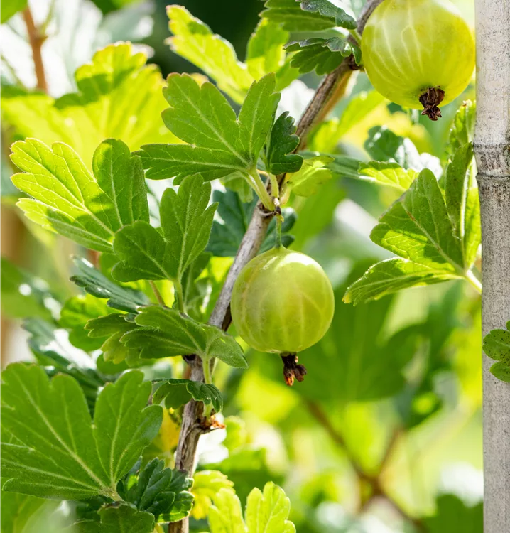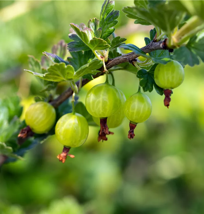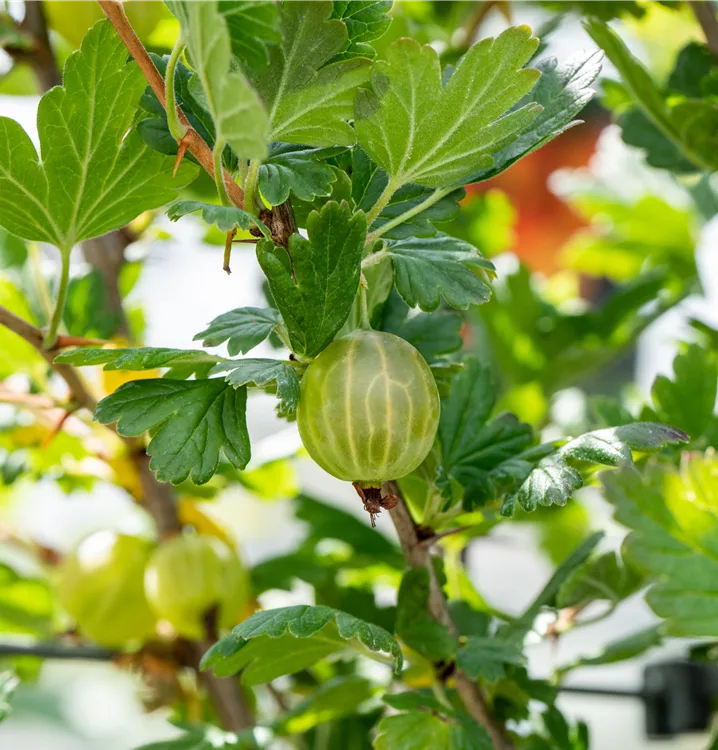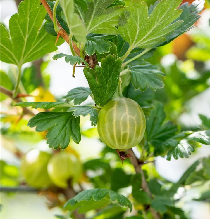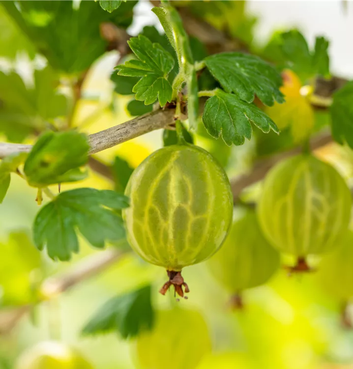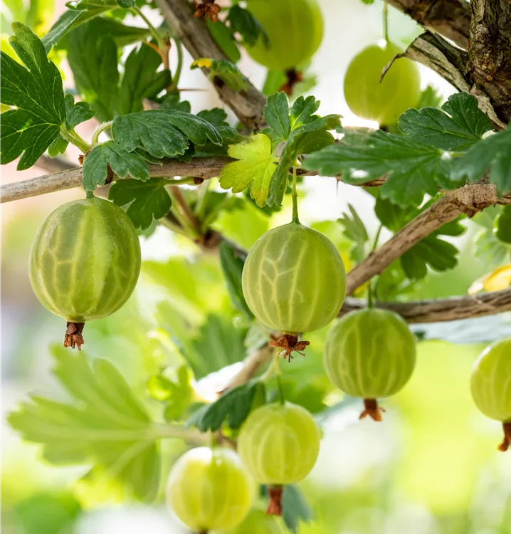 Die Stachelbeere 'Mucurines' (Ribes uva-crispa) bildet hellgrüne, grosse Beeren. Diese sind fest und süss im Geschmack. Für eine ertragreiche Ernte ab Juli schaffen durchlässiger, lockerer, nährstoffreicher Boden und ein sonniger bis halbschattiger Standort optimale Bedingungen. Ihre weissen Blüten sind eine schöne Erscheinung.