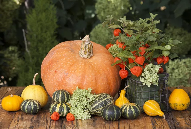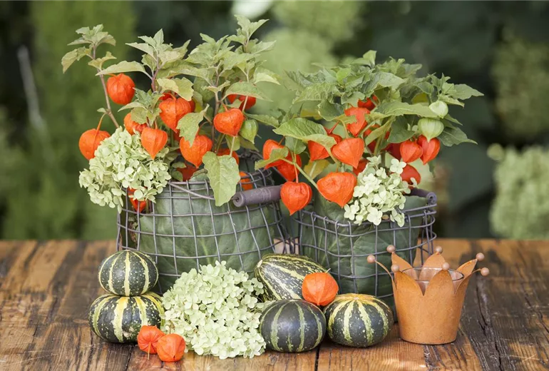 Wem die bunten Lampions nicht reichen, kann die Pflanze auch sehr gut in Pflanzenarrangements integrieren oder im Topf gepflanzt zur übrigen Herbstdekoration dazu stellen. Besonders gut passt die Lampionblume in einem Arrangement zur Moorheide. Die herbstlichen Farben der beiden Pflanzen ergänzen sich perfekt und erzeugen so eine ruhige Atmosphäre. Ein paar Zierkürbisse dazu und fertig ist die Herbstdekoration auf dem Gartentisch oder dem Balkon.