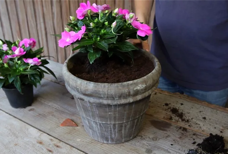 Wenn Sie die Edellieschen in ein grösseres Gefäss umsetzen, entfernen Sie zunächst den alten Topf, damit die Pflanzen neue Wurzeln bilden können und sich so optimal mit Wasser und Nährstoffen aus der neuen Erde versorgen können.