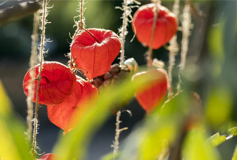 Lampionblumen tragen im Herbst schöne orangene Lampions, die nicht nur im Beet eine gute Figur machen. Aus den kleinen Fruchtblasen (das sind die nämlich) lassen sich eine Menge kreativer Dekorationen herstellen. Dafür braucht es neben den Lampions nur ein paar wenige Materialien:
